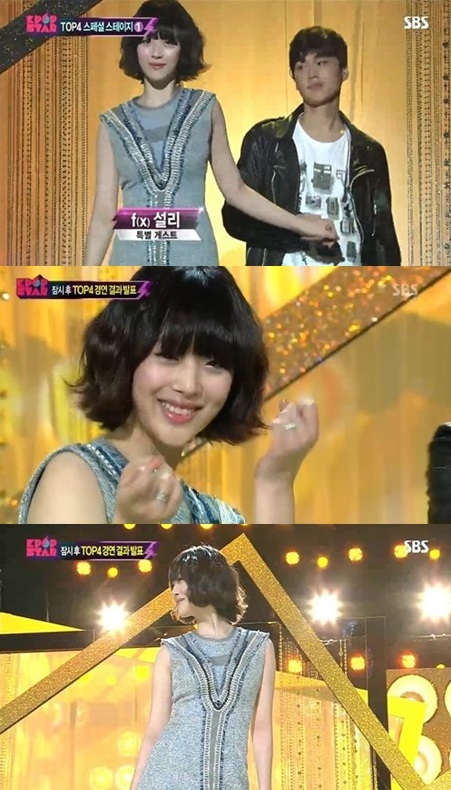 설리는 박진영의 곡 '그녀는 예뻤다'에 맞춰 도전자들과 커플댄스를 선보였으며 상큼한 미소와 섹시한 의상으로 팬들의 큰 환호를 받았다.