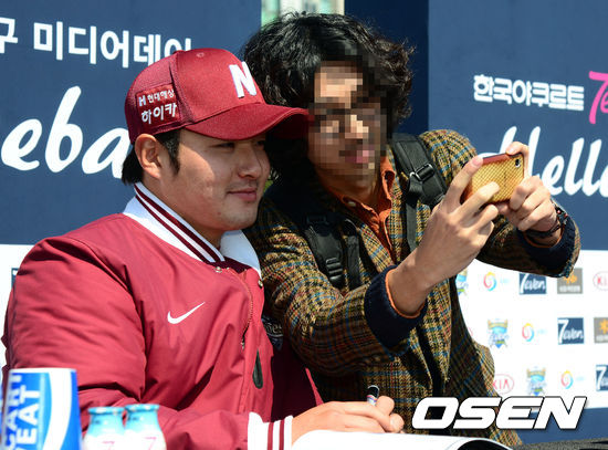 미디어데이 행사에 앞서 열린 팬사인회에서 박병호가 남성팬과 기념촬영을 하고 있다.