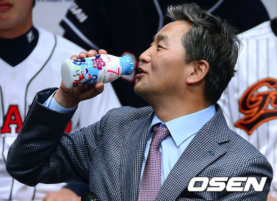 두산 김진욱 감독이 사회자의 요구에 커피 마시는 모습을 연출하고 있다.