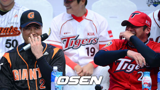 KIA 서재응이 사회자가 조성환에게 질문한 내용을 듣고 미소를 짓고 있다.