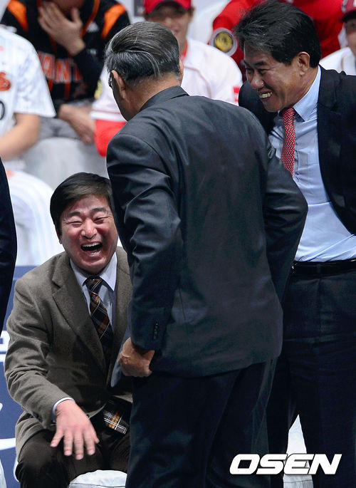 삼성 류중일 감독이 미디어데이 행사가 끝나기전에 자리를 뜨는 김응룡 감독을 보고 웃음을 짓고 있다.