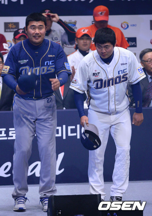 NC 이호준과 권희동이 포토타임을 갖고 있다.