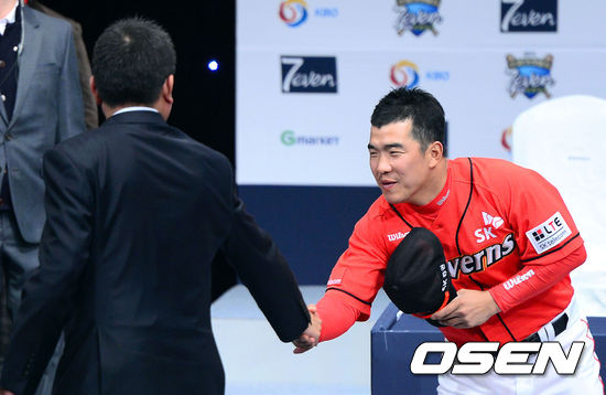 미디어데이를 마친 뒤 LG 봉중근과 SK 정근우가 악수를 나누고 있다.