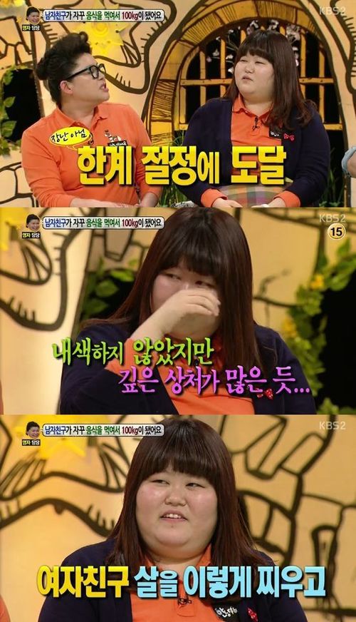 남자친구에게 사육을 당해 100kg까지 체중이 증가한 여성이 KBS 2TV 예능 프로그램'대국민 토크쇼 안녕하세요'(이하 안녕하세요)에 출연해 눈물을 펑펑 쏟았다.