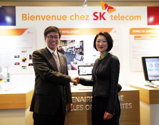 하성민 SK텔레콤 CEO(왼쪽)와 플뢰르 펠르렝 프랑스 장관. /SK텔레콤 제공.