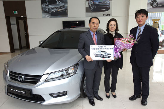 북미생산 100만 번째 어코드를 구매한 박정화 씨는 “이와 같이 깊은 의미를 지닌 어코드의 주인이 되어 개인적으로 기쁘고 영광스럽게 생각한다”며, “익히 알고 있던 혼다의 제품 품질과 고객서비스에 대한 명성을 확인하는 계기가 되어 더욱 만족스럽다”고 소감을 밝혔다.