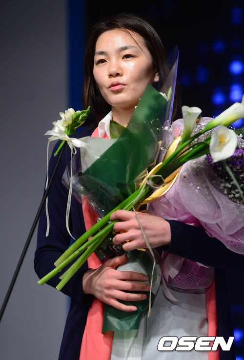26일 오전 서울 한남동 그랜드 하얏트 호텔에서 열린 KDB 금융그룹 2012-13시즌 여자프로농구(WKBL) 시상식에서 '3득점상'을 수상한 한채진이 수상 소감을 말하고 있다.