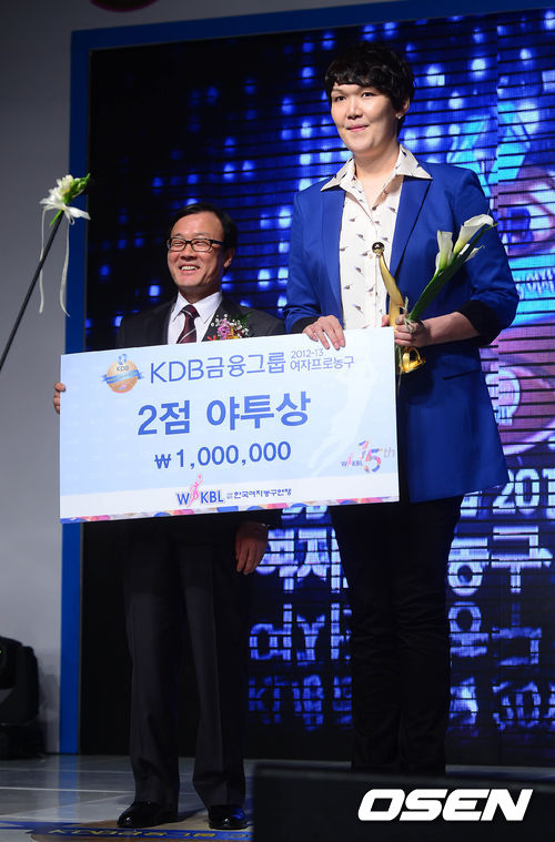 26일 오전 서울 한남동 그랜드 하얏트 호텔에서 열린 KDB 금융그룹 2012-13시즌 여자프로농구(WKBL) 시상식에서 '2점 야투상'을 수상한 하은주가 우리은행 이순우 구단주와 기념촬영을 하고 있다.