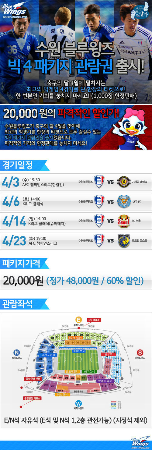 수원은 26일 “4월에 빅버드(수원월드컵경기장)에서 치러질 홈 4경기를 한 장의 티켓으로 관전할 수 있는 신상품을 인터파크(www.interpark.com)를 통해 판매한다”며 “1000매 한정판매로 가격은 2만원이며 가시와 레이솔전(4/3), 대구FC전(4/6), FC서울전(4/14), 센트럴코스트전(4/23)이 해당된다. 구단은 “앞으로도 다양한 신상품을 잇따라 출시해 더욱 많은 축구팬들이 K리그 클래식과 친해질 수 있도록 집중 홍보할 계획”이라고 전했다.