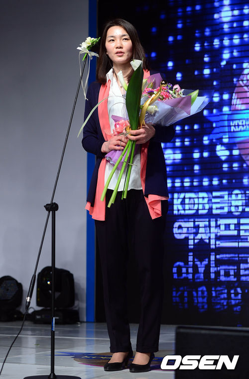 26일 오전 서울 한남동 그랜드 하얏트 호텔에서 열린 KDB 금융그룹 2012-13시즌 여자프로농구(WKBL) 시상식에서 '우수수비선수상'을 수상한 한채진이 수상 소감을 말하고 있다.