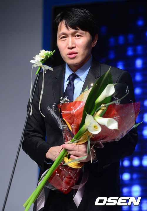 26일 오전 서울 한남동 그랜드 하얏트 호텔에서 열린 KDB 금융그룹 2012-13시즌 여자프로농구(WKBL) 시상식에서 '지도상'을 수상한 우리은행 위성우 감독이 수상 소감을 말하고 있다.
