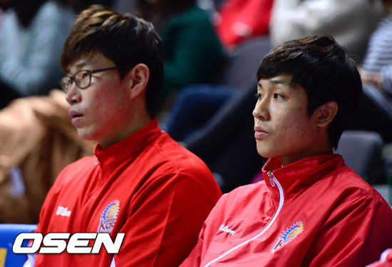 26일 오후 고양실내체육관에서 열린 '2012-2013 KB국민카드 프로농구' 6강 플레이오프 3차전 고양 오리온스와 안양 KGC의 경기에서 KGC 김태술과 오세근이 벤치에 앉아 경기를 관전하고 있다.