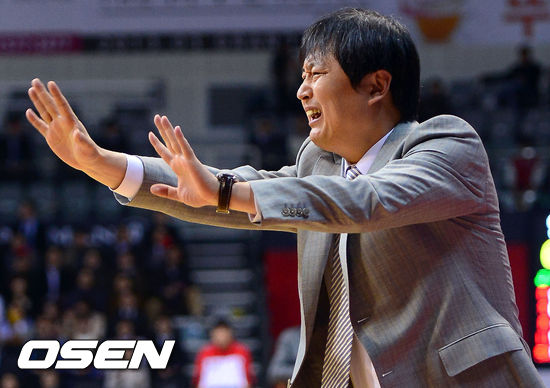 26일 오후 고양실내체육관에서 열린 '2012-2013 KB국민카드 프로농구' 6강 플레이오프 3차전 고양 오리온스와 안양 KGC의 경기 1쿼터 KGC 이상범 감독이 선수들에게 이야기를 하고 있다.
