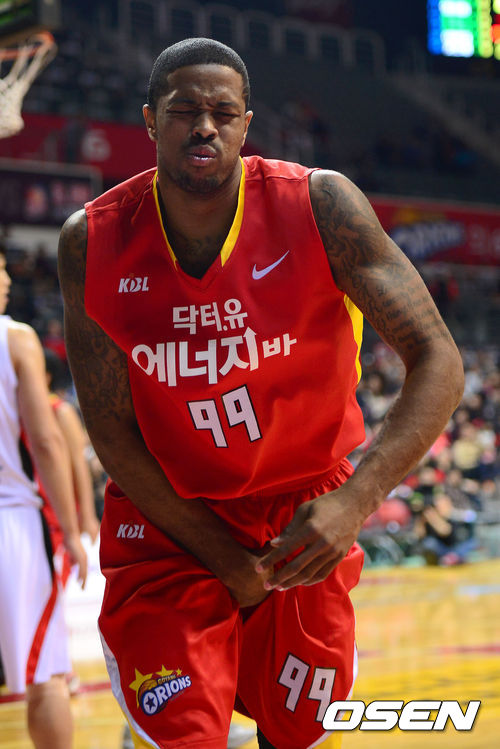 26일 오후 고양실내체육관에서 열린 '2012-2013 KB국민카드 프로농구' 6강 플레이오프 3차전 고양 오리온스와 안양 KGC의 경기 2쿼터 오리온스 테일러가 KGC 수비와 충돌한 뒤 고통을 호소 하고 있다.