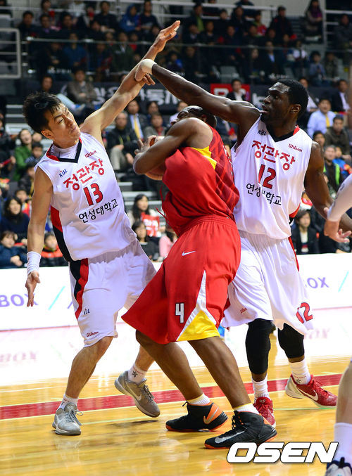 26일 오후 고양실내체육관에서 열린 '2012-2013 KB국민카드 프로농구' 6강 플레이오프 3차전 고양 오리온스와 안양 KGC의 경기 2쿼터 KGC 김성철과 파틸로가 오리온스 윌리엄스의 슛을 막기위해 블로킹을 시도하고 있다.