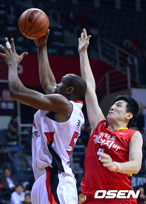 26일 오후 고양실내체육관에서 열린 '2012-2013 KB국민카드 프로농구' 6강 플레이오프 3차전 고양 오리온스와 안양 KGC의 경기 3쿼터 오리온스 최진수가 KGC 키브웨의 레이업을 블로킹으로 막으려하고 있다.