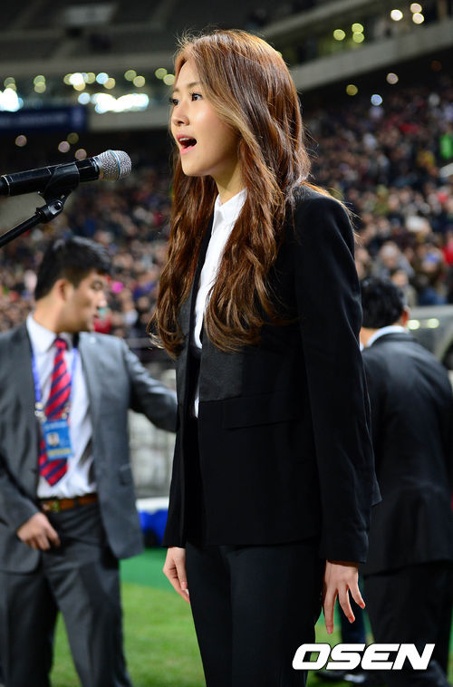 26일 오후 서울월드컵경기장에서 열린 '2014 브라질 월드컵 최종예선 5차전' 대한민국과 카타르의 경기 시작 전 허가윤이 애국가를 부르고 있다.