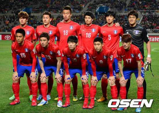 26일 오후 서울월드컵경기장에서 열린 '2014 브라질 월드컵 최종예선 5차전' 대한민국과 카타르의 경기 시작 전 선수들이 기념촬영을 하고 있다.