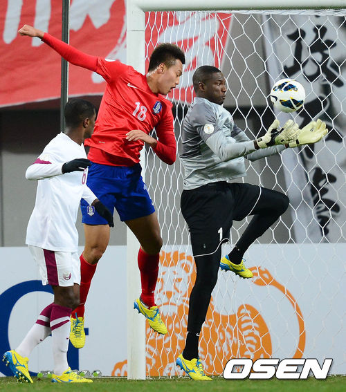 26일 오후 서울월드컵경기장에서 열린 '2014 브라질 월드컵 최종예선 5차전' 대한민국과 카타르의 경기 전반 김신욱이 문전에서 헤딩 기회를 놓치고 있다.