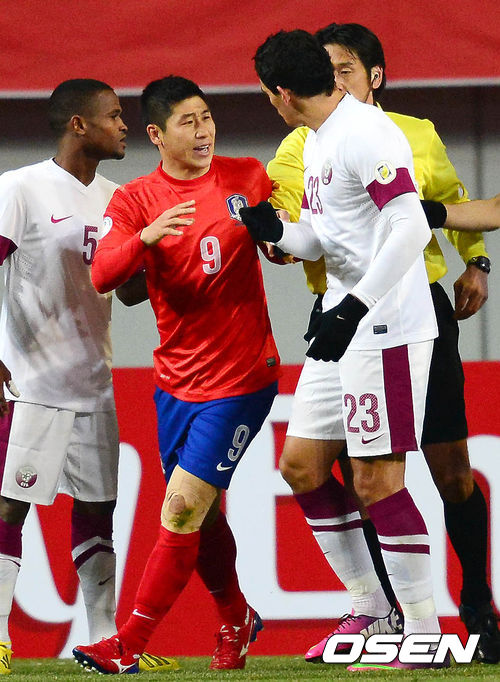 26일 오후 서울월드컵경기장에서 열린 '2014 브라질 월드컵 최종예선 5차전' 대한민국과 카타르의 경기 전반 이근호가 카타르 수비와 말다툼을 하고 있다.