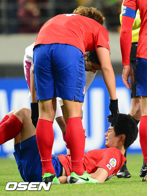 26일 오후 서울월드컵경기장에서 열린 '2014 브라질 월드컵 최종예선 5차전' 대한민국과 카타르의 경기 전반 기성용이 카타르 수비와 충돌 후 고통을 호소하고 있다.
