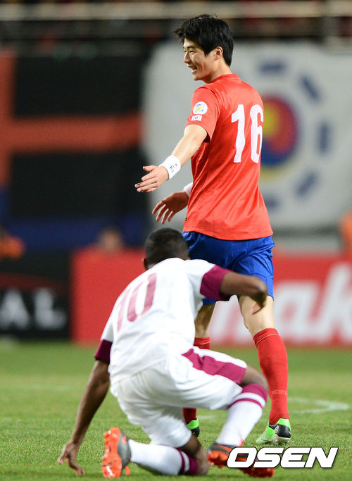 26일 오후 서울월드컵경기장에서 열린 '2014 브라질월드컵 최종예선 5차전' 대한민국과 카타르의 경기, 전반전 한국 기성용이 카타르 수지수와 몸싸움을 벌인 후 반칙이 선언되자 아쉬운 표정을 짓고 있다.