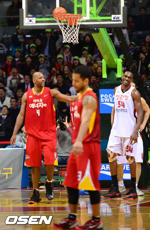 26일 오후 고양실내체육관에서 열린 '2012-2013 KB국민카드 프로농구' 6강 플레이오프 3차전 고양 오리온스와 안양 KGC의 경기 3쿼터 종료 직전 오리온스 정재홍의 3점슛이 림과 백보드 사이에 걸려 경기가 중단되자 오리온스 윌러엄스와 KGC 키브웨가 어이없는 미소를 짓고 있다.