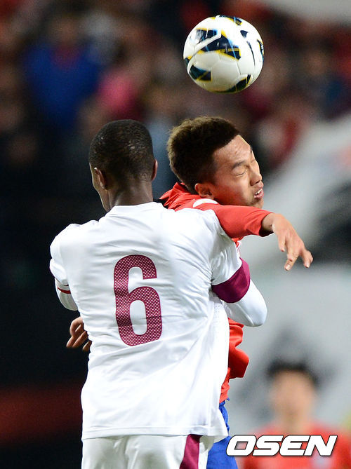 26일 오후 서울월드컵경기장에서 열린 '2014 브라질월드컵 최종예선 5차전' 대한민국과 카타르의 경기, 전반전 한국 김신욱이 카타르 수비수와 공중볼 다툼을 하고 있다.