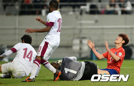 26일 오후 서울월드컵경기장에서 열린 '2014 브라질월드컵 최종예선 5차전' 대한민국과 카타르의 경기, 전반전 한국 이청용이 카타를 문전에서 시도한 슛이 빗나가자 아쉬워하고 있다.