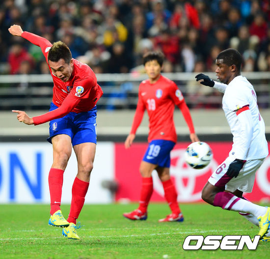 26일 오후 서울월드컵경기장에서 열린 '2014 브라질월드컵 최종예선 5차전' 대한민국과 카타르의 경기 전반 김신욱이 문전에서 강슛을 날리고 있다.