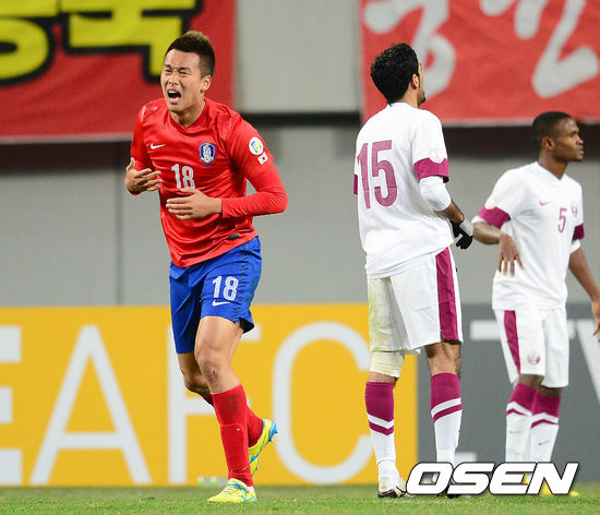 26일 오후 서울월드컵경기장에서 열린 '2014 브라질 월드컵 최종예선 5차전' 대한민국과 카타르의 경기 전반 김신욱이 골 기회를 놓치자 아쉬워하고 있다.
