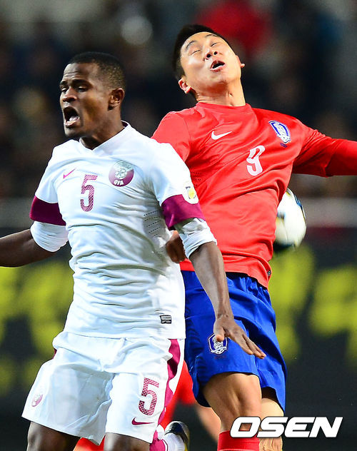 26일 오후 서울월드컵경기장에서 열린 '2014 브라질월드컵 최종예선 5차전' 대한민국과 카타르의 경기 후반 이근호가 공중 볼 다툼을 하고 있다.