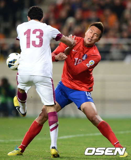 26일 오후 서울월드컵경기장에서 열린 '2014 브라질월드컵 최종예선 5차전' 대한민국과 카타르의 경기, 후반전 한국 김신욱이 카타르 수비수과 충돌을 피하고 있다.