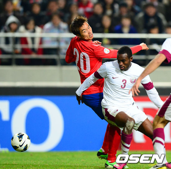 26일 오후 서울월드컵경기장에서 열린 '2014 브라질월드컵 최종예선 5차전' 대한민국과 카타르의 경기 후반 이동국이 볼을 뺏기고 있다.