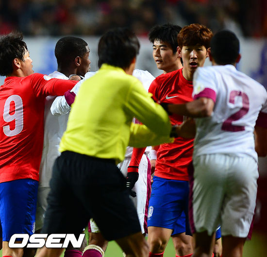26일 오후 서울월드컵경기장에서 열린 '2014 브라질월드컵 최종예선 5차전' 대한민국과 카타르의 경기 후반 양팀 선수들이 충돌하고 있다.