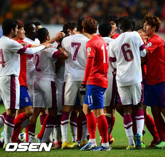 26일 오후 서울월드컵경기장에서 열린 '2014 브라질월드컵 최종예선 5차전' 대한민국과 카타르의 경기 후반 양팀 선수들이 충돌을 하고 있다.