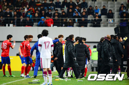 멱살을 잡을 듯 험악한 분위기에 관중석에서는 물병까지 날아들었다. 승점 3점을 반드시 따내야하는 상황의 한국과 어떻게든 승점을 챙겨 돌아가려는 카타르의 경기는 신경질적인 분위기 속 '일촉즉발' 그 자체였다.