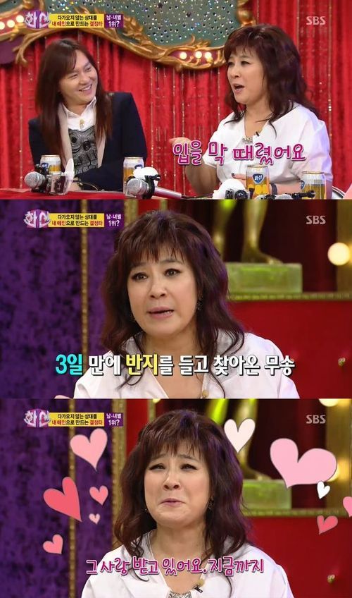 그는 이어 "그런데 이무송은 2년 동안 나에게 한 번도 스킨십을 안 해줬다. 마음이 상해서 연락 끊었다. 그랬더니 그 때 전화가 와서 결혼하자고 했다. 갑자기 완전 무관심해지니까 자기가 너무 놀라고, 두렵고, 무섭고 내가 너무 좋아졌다더라"고 말했다.