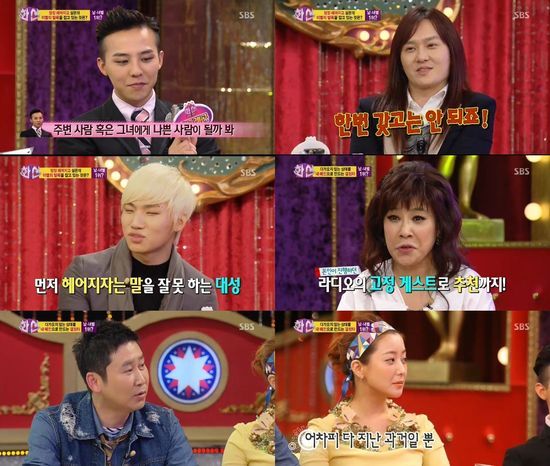 지난 26일 오후 방송된 SBS 예능프로그램 '화신-마음을 지배하는 자'(이하 '화신') 남녀대첩특집에서는 '더 이상 다가오지 않는 상대를 내 애인으로 만들 결정타', '당장 헤어지고 싶은데 이별의 발목을 잡고 있는 것은' 등의 주제를 놓고 가수 김경호, 가희, 노사연, 빅뱅의 지드래곤, 대성이 출연해 솔직한 입담을 과시했다.