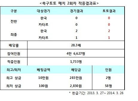 국민체육진흥공단(www.kspo.or.kr)의 체육진흥투표권 수탁사업자인 스포츠토토㈜(www.sportstoto.co.kr)는 지난 26일 오후 8시 서울월드컵경기장에서 벌어진 한국(홈)과 카타르(원정)의 2014브라질월드컵 아시아지역 최종예선 A조 5차전을 대상으로 한 축구토토 매치 2회차 게임에서 모두 1733명의 축구팬이 경기 결과를 정확히 맞혀 각각 베팅금액의 28.3배에 달하는 적중상금을 받게 됐다고 밝혔다.