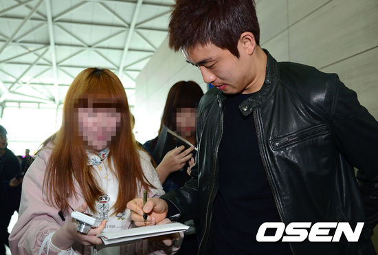 출국에 앞서 윤석영이 여성팬에게 사인을 해주고 있다.