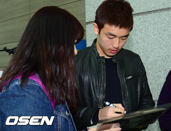 출국에 앞서 윤석영이 여성팬에게 사인을 해주고 있다.