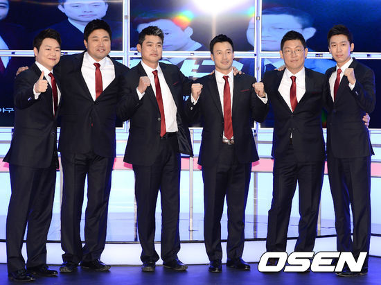 27일 오후 서울 상암동 SBS프리즘타워에서 열린 'SBS ESPN 2013 프로야구 기자간담회'에서 윤성호 아나운서, 양준혁, 안경현, 김재현, 김정준 해설위원, 이동근 아나운서가 포토타임을 갖고 있다.