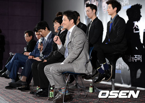 27일 오후 서울 행당동 CGV 왕십리에서 열린 영화 '전설의 주먹' (감독 강우석) 언론시사회에서 배우 황정민, 유준상, 이요원, 윤제문, 정웅인이 취재진의 질문에 답을 하고 있다.