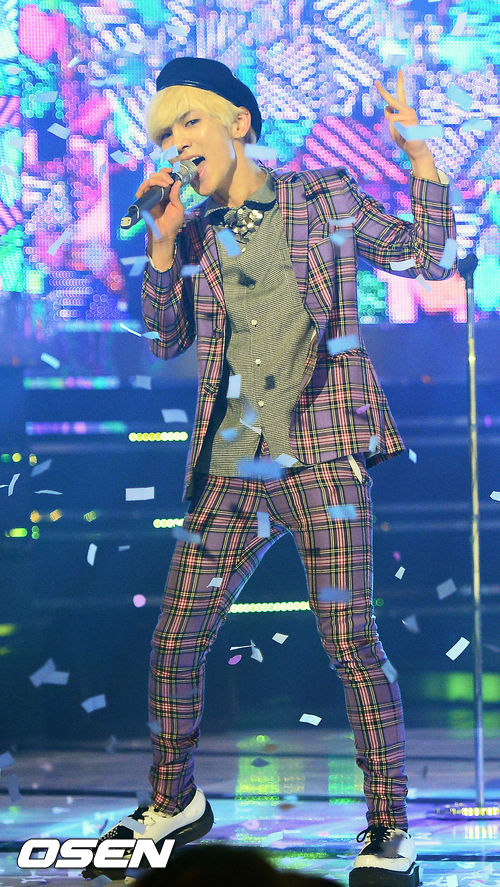 지난 20일 오전 서울 유니클로 악스홀에서 열린 MBC MUSIC '쇼 챔피언' 54회 사전 녹화 무대에서 샤이니가 열창을 하며 화려한 무대를 선보이고 있다.