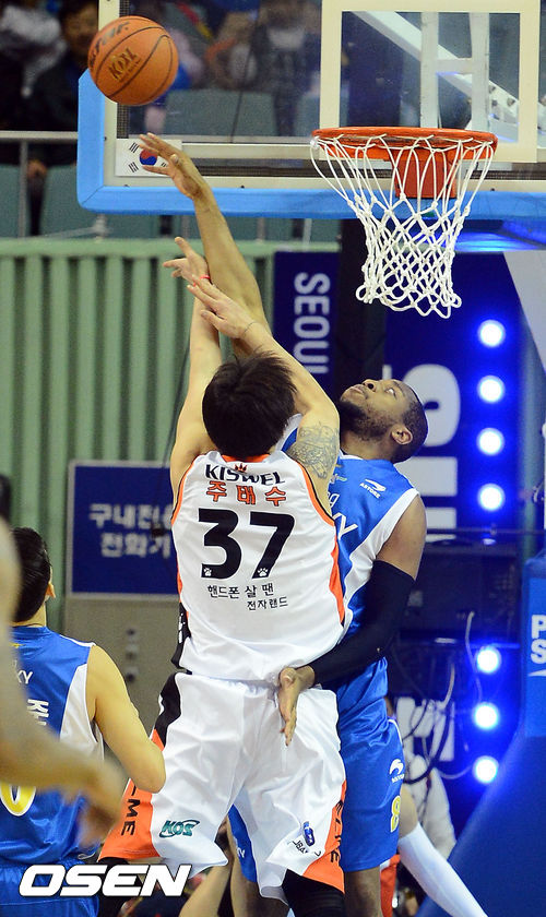 27일 오후 서울 잠실실내체육관에서 열린 'KB 국민카드 2012-2013 프로농구' 6강 플레이오프 서울 삼성과 인천 전자랜드의 경기 1쿼터 삼성 타운스가 전자랜드 주태수의 슛을 슛블록하고 있다