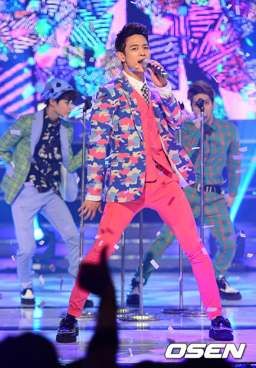 지난 20일 오전 서울 유니클로 악스홀에서 열린 MBC MUSIC '쇼 챔피언' 54회 사전 녹화 무대에서 샤이니가 열창을 하며 화려한 안무를 선보이고 있다.