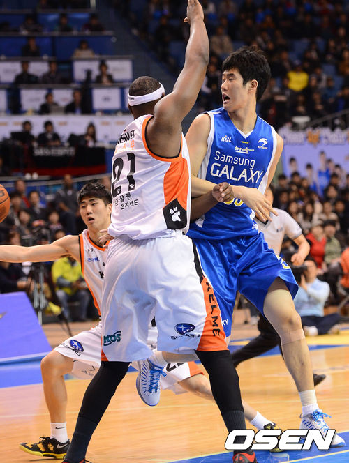 27일 오후 서울 잠실실내체육관에서 열린 'KB 국민카드 2012-2013 프로농구' 6강 플레이오프 서울 삼성과 인천 전자랜드의 경기 2쿼터 삼성 임동섭이 노룩패스 시도하고 있다