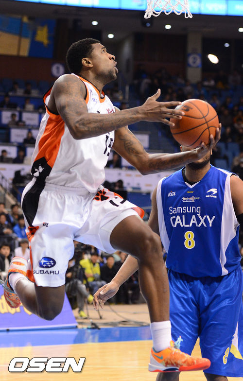 27일 오후 서울 잠실실내체육관에서 열린 'KB 국민카드 2012-2013 프로농구' 6강 플레이오프 서울 삼성과 인천 전자랜드의 경기, 3쿼터 전자랜드 포웰이 리버스레이업슛을 시도하고 있다