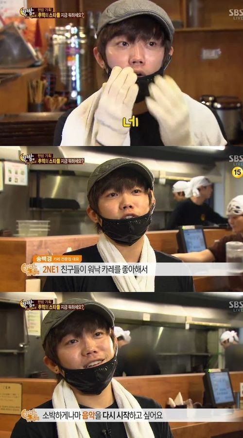이날 방송에서 송백경은 손수 자신의 가게에서 일을 하는 모습을 보여주며 눈길을 끌었다. 또 그는 “2NE1이 단골 손님”이라며 “2NE1이 카레를 좋아해서 특별히 테이크아웃 해서 주곤 한다”고 밝혔다.